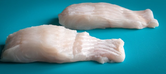 I bought two filets of Atlantic wolffish (Anarhichas lupus), also known as the seawolf, Atlantic catfish, ocean catfish, devil fish, wolf eel (the common name for its Pacific relative), or sea cat, is a marine fish, the largest of the wolffish family Anarhichadidae.