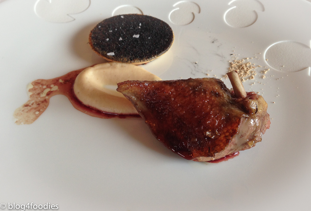 - Roasted pigeon slightly smoked with conifer, celery and hazelnut: