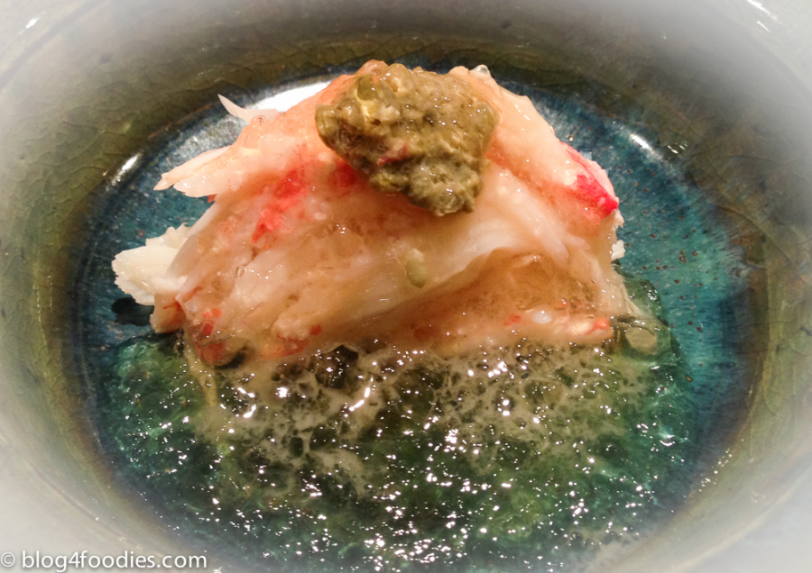 Sea Bream garnished with fresh seaweed and Japanese herbs and Snow Crab topped with crab innards with broth jelly.