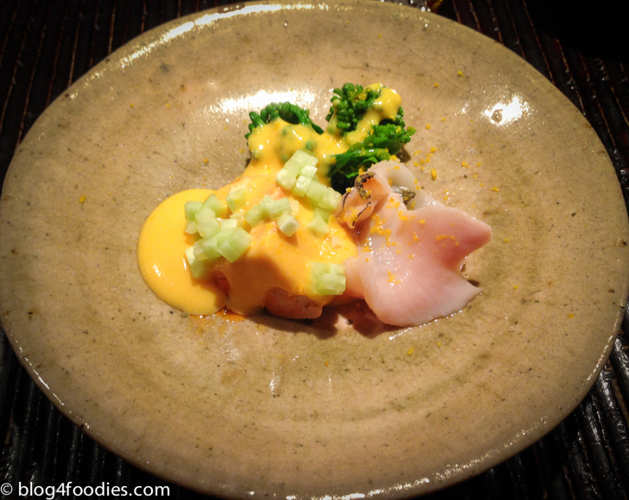 Hard Clam, Monkfish Liver and Ripe Flower Bud, covered with egg yolk and sauce with Japanese mustard.