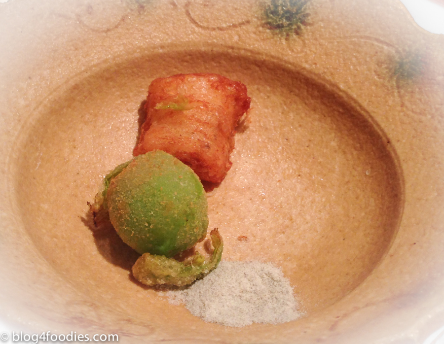 Conger Eel with mashed garden peas with Butterbur Bud Petals. Served with a dipping sauce.