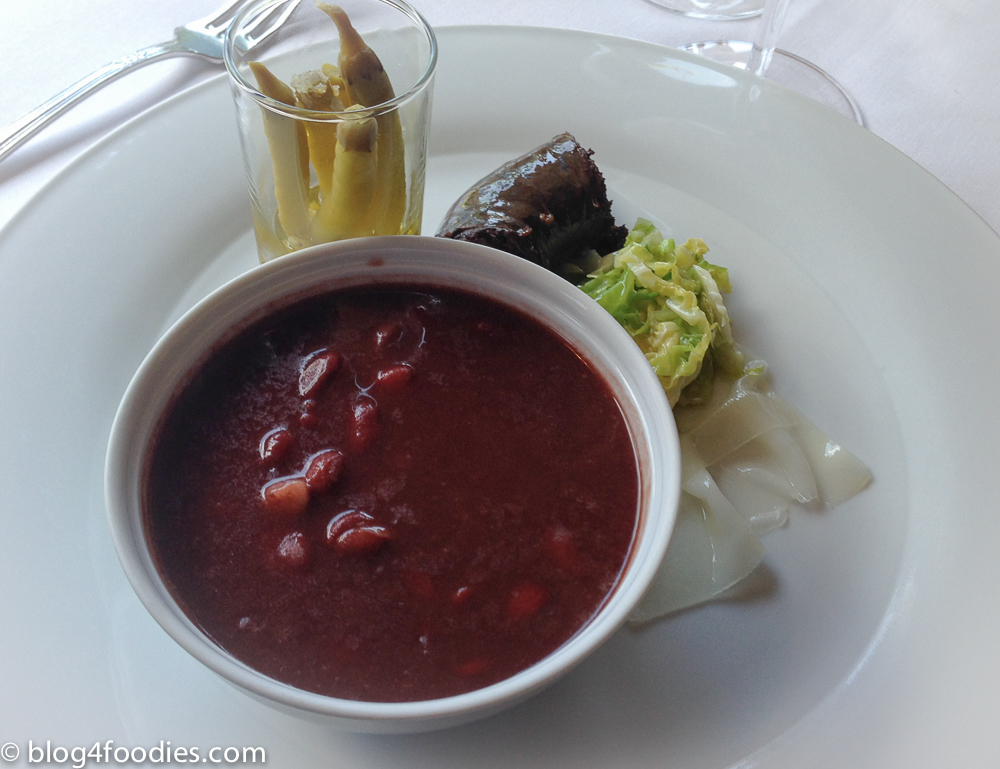 The traditional Tolosa black beans, served with cabbage, pickled guindilla peppers from Ibarra, pork-belly fat, and traditional black pudding from Beasain: