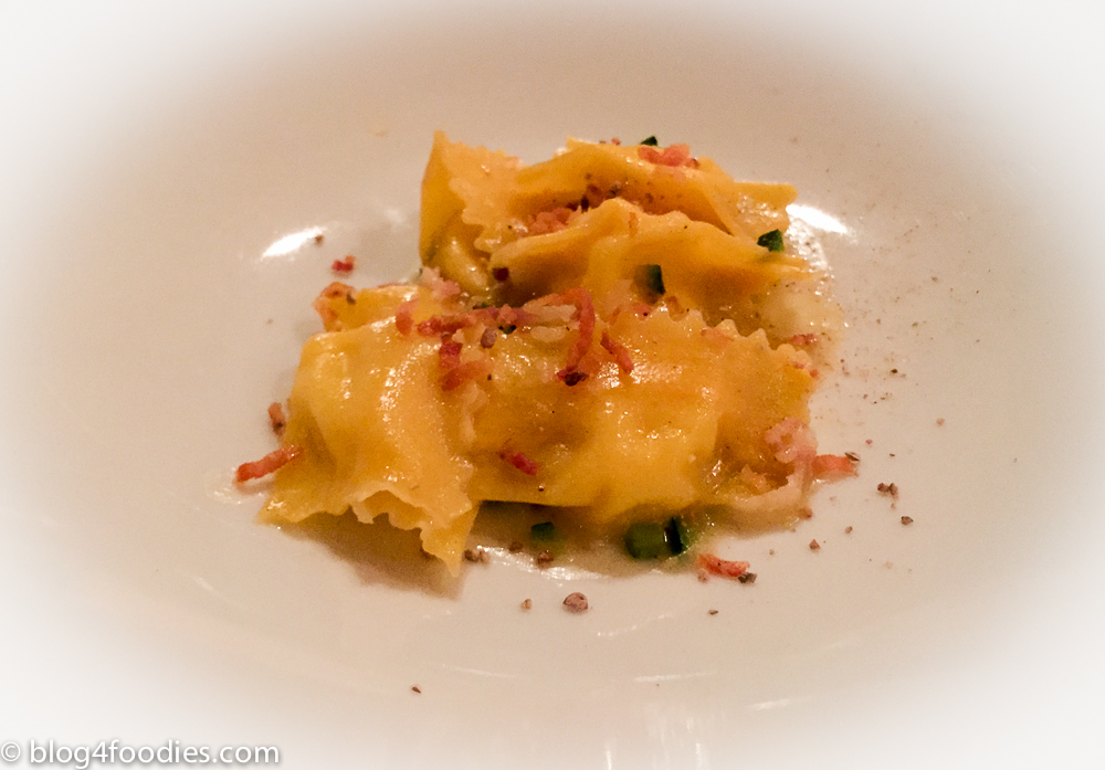 Fagottelli “La Pergola” is the most famous dish created by Heinz Beck and served at La Pergola. The fagotelli, which are little square parcels, are filled with a carbonara sauce (yolks, pecorino cheese, whipped cream, salt and white pepper), cooked and finished in the pan with some white wine, zucchini, veal stock and pecorino cheese. On the plate, some crispy bacon is added.
