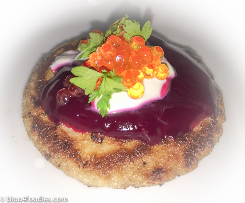Blini – Beet fluid gel – Crème fraîche – Trout roe – Chervil:
