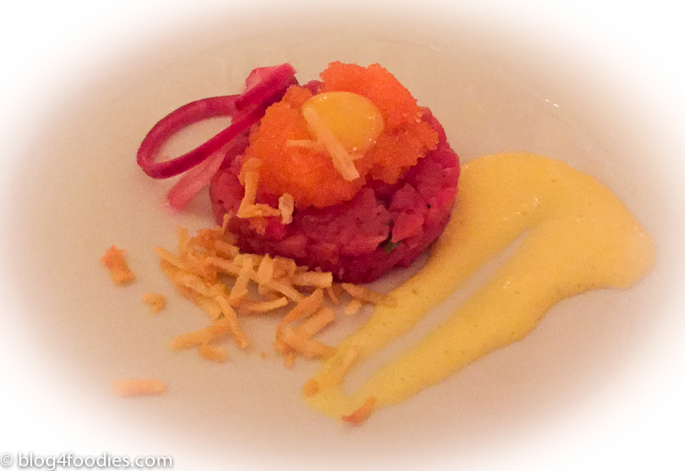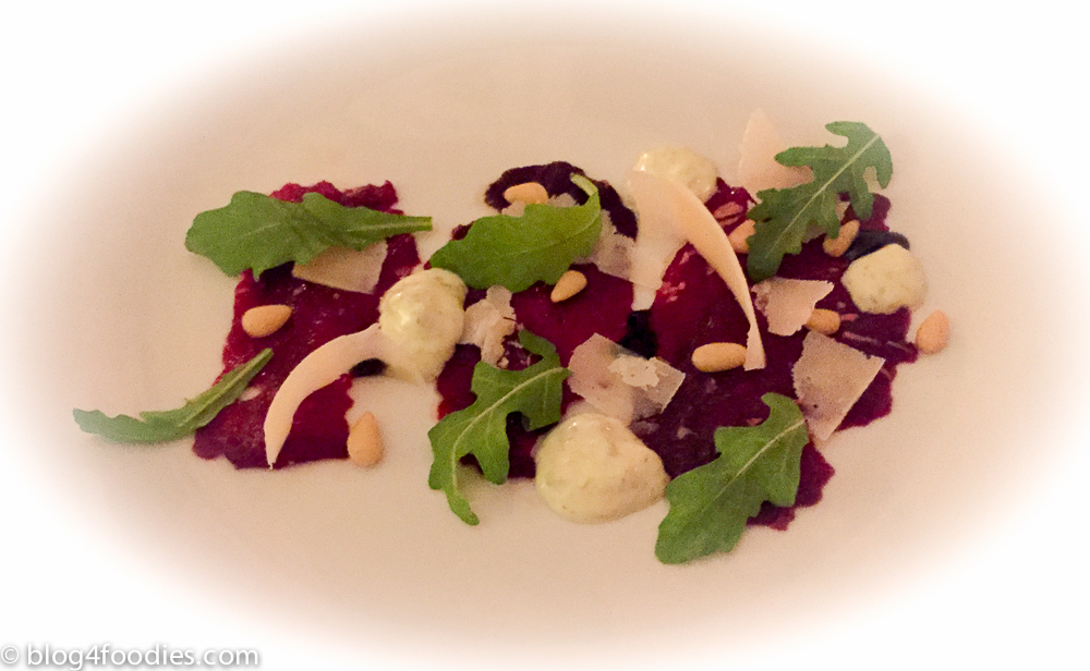 One bite amuse-bouche blini with a Beet fluid gel, Crème fraîche, Trout roe and Chervil. A bad picture, otherwise it would have shown that the Beet fluid gel is having a beautiful, bright appearance. This fluid gel is “developed” by Chefsteps specifically for blinis in mind and the complete recipe can be found here.