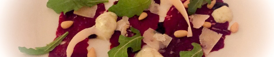 Carpaccio of Norwegian Minke whale (minkehval). Served with wild garlic pesto and arugula.