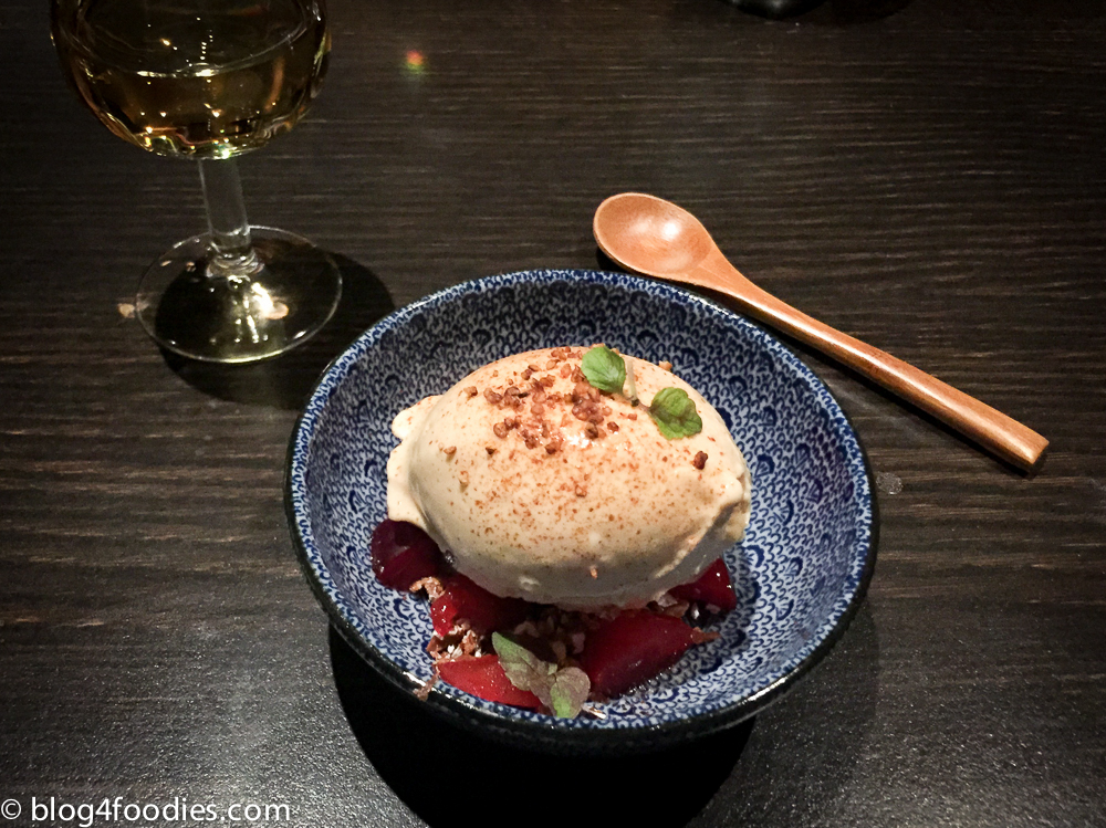 A sweet and salt cream cheese ice cream flavored with soy caramel, plum and toffee-roasted buckwheat. Very very good!