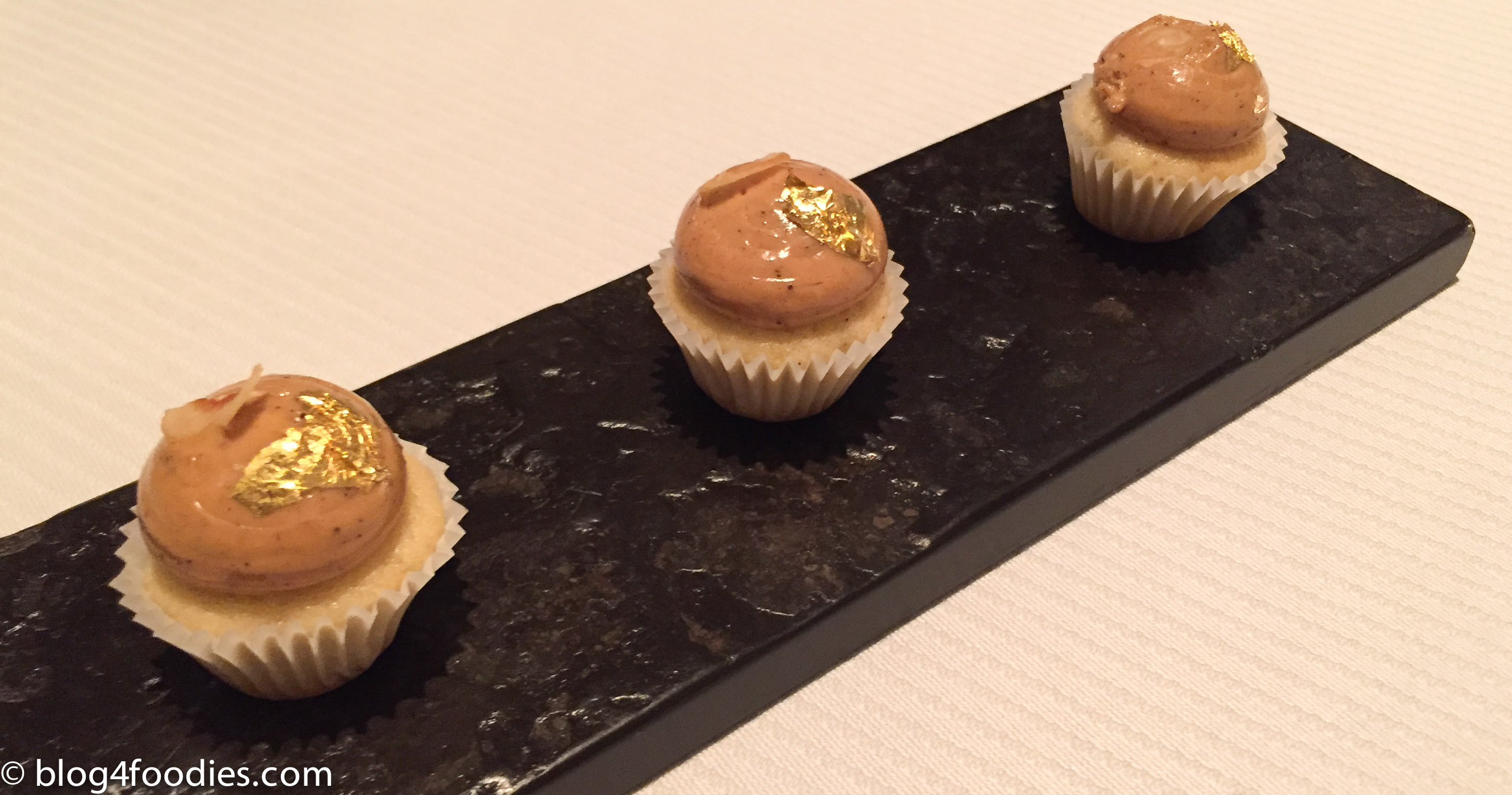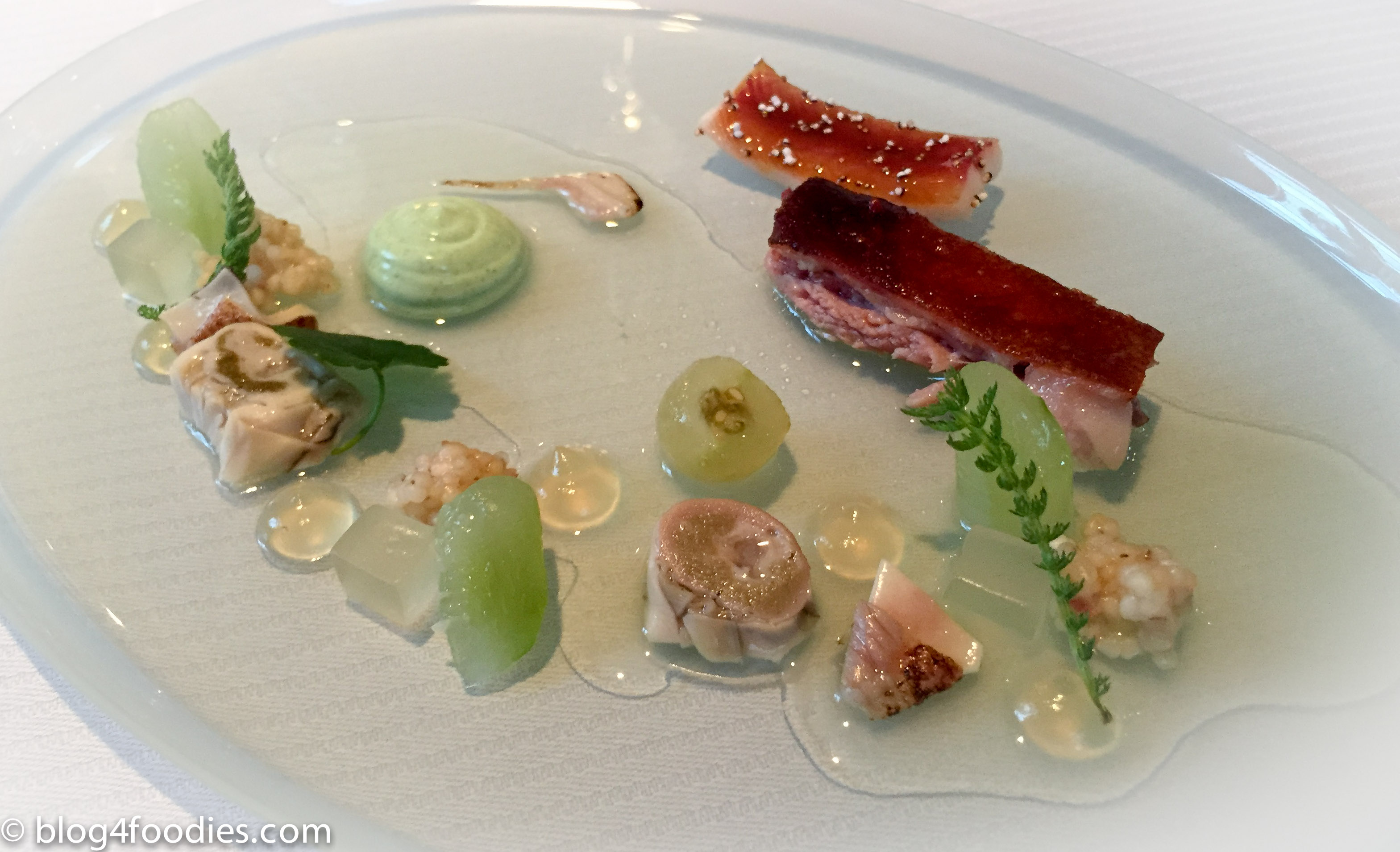 This amusement is a play on the usually creamy German Toffee Candy (Sahne Bonbon) but with all original ingredients substituted for the best possible products like Foie Gras and Piedmont hazelnut. A good start of this dinner!