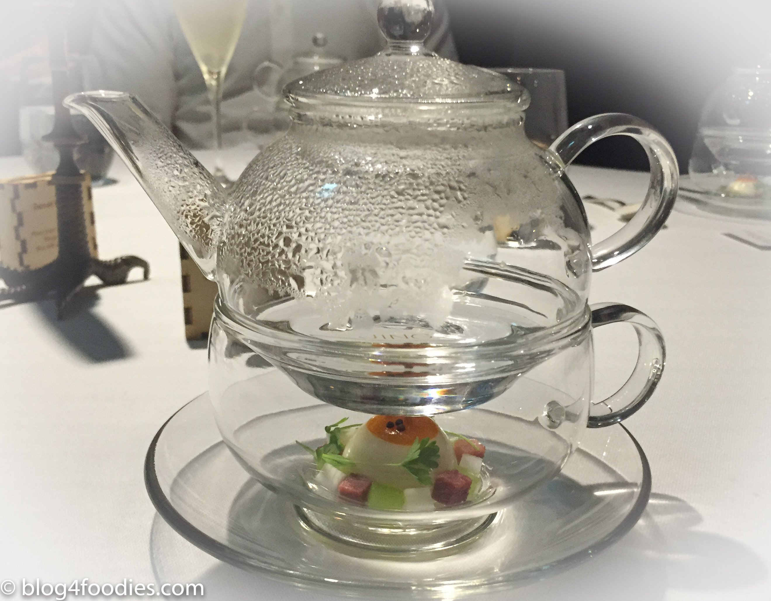 The “tea” contains a velouté (“tea”) of rabbit with tarragon and mustard, and was cold on one side and hot on the other. Both good and interesting!