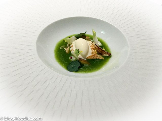 This new dish (“Then we went rockpooling”) on the menu consisted of crab, trout roe, smoked caviar, white chocolate, mussel veloute, and clam-sea water jelly. Nice!