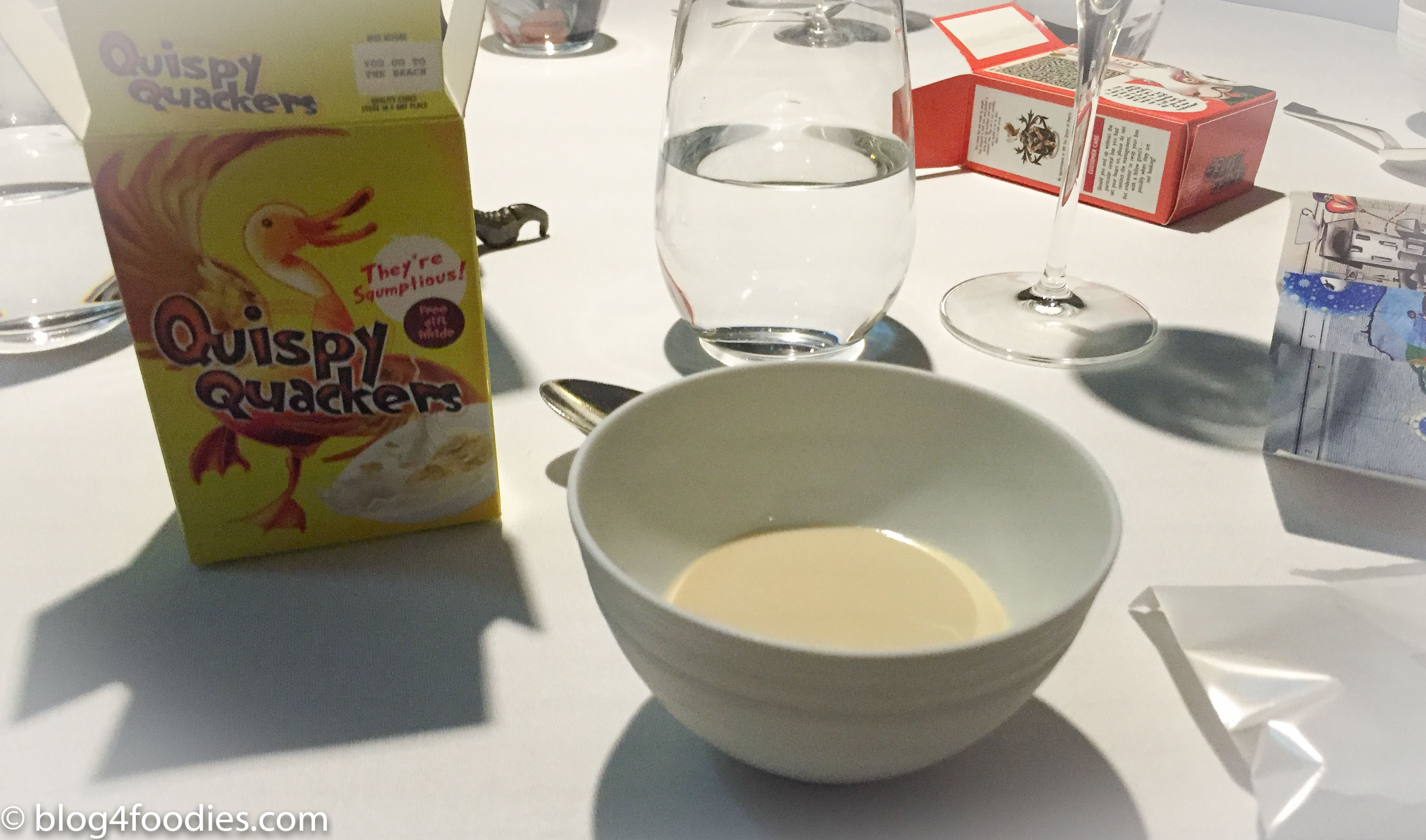 English flavor-packed cereals arrived in miniature packages. The bowl accompanying the cereals (i.e. where the cereals were poured) contained a scrambled egg custard with truffles at the bottom, charted by layers of tomato jelly, bacon and toast cream.