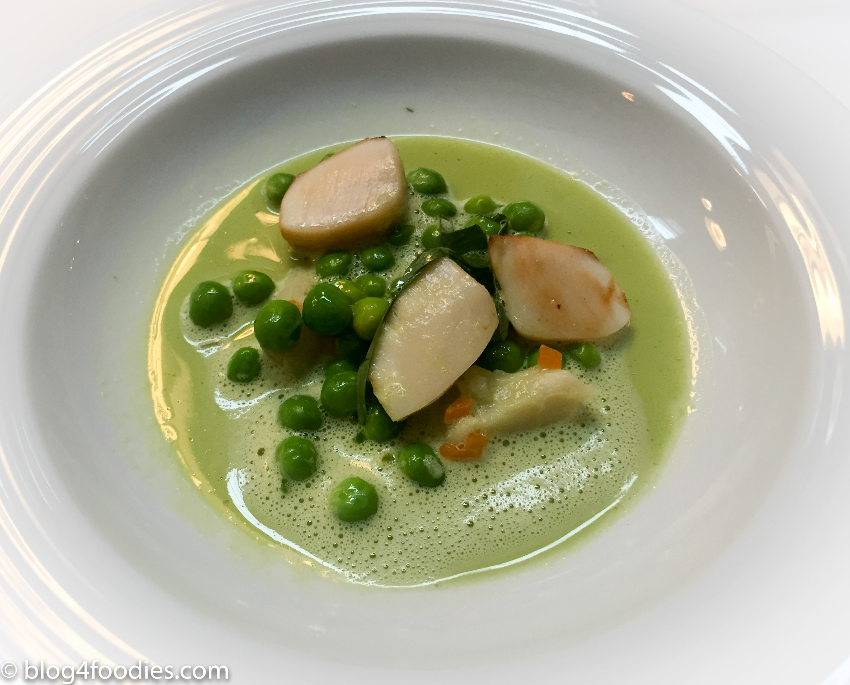 Seared scallops, petit pois, tarragon, slightly buttered mussel broth.