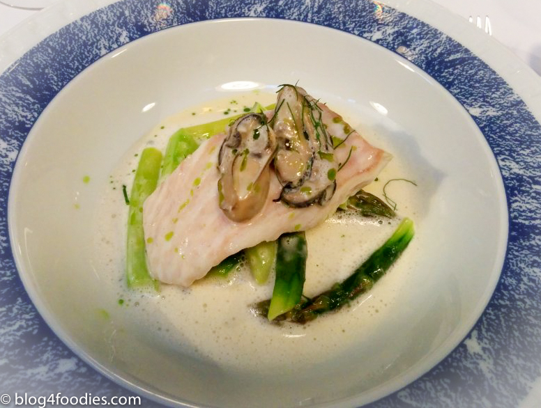 Butter poached turbot, asparagus, poached oysters, oyster sauce.