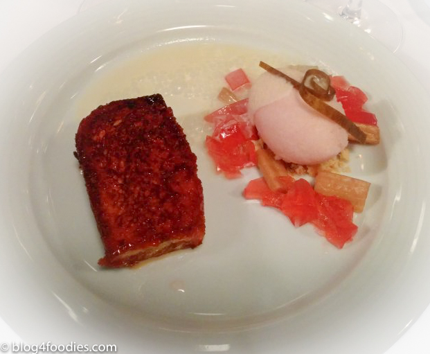 Pain perdu, rhubarb, rhubarb sorbet, toasted bread foam.