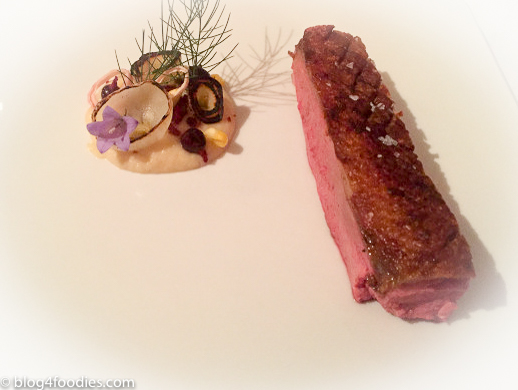 Corn duck from Munka-Ljungby, served with black currants from our garden and crunch: