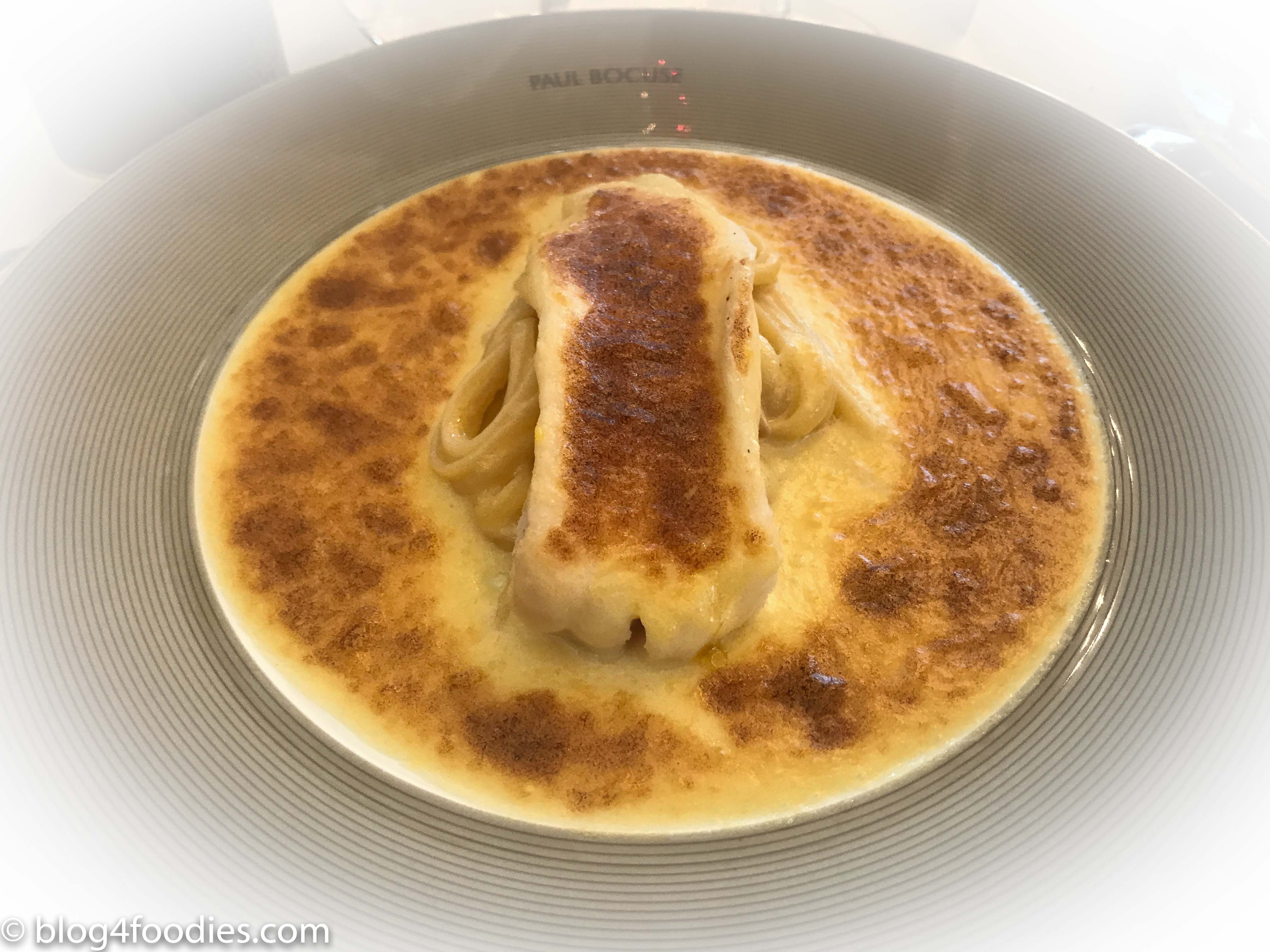 Third serving of the menu: Filet of sole with tagliatelle (noodles) à la Fernand Point (the famous former chef at La Pyramide, under who Bocuse once trained). Good quality sole, blameless prepared and served with noodles and a cream- and butter sauce and then caramelized. This was a good dish, but for me, a little bit too stubborn and outdated.