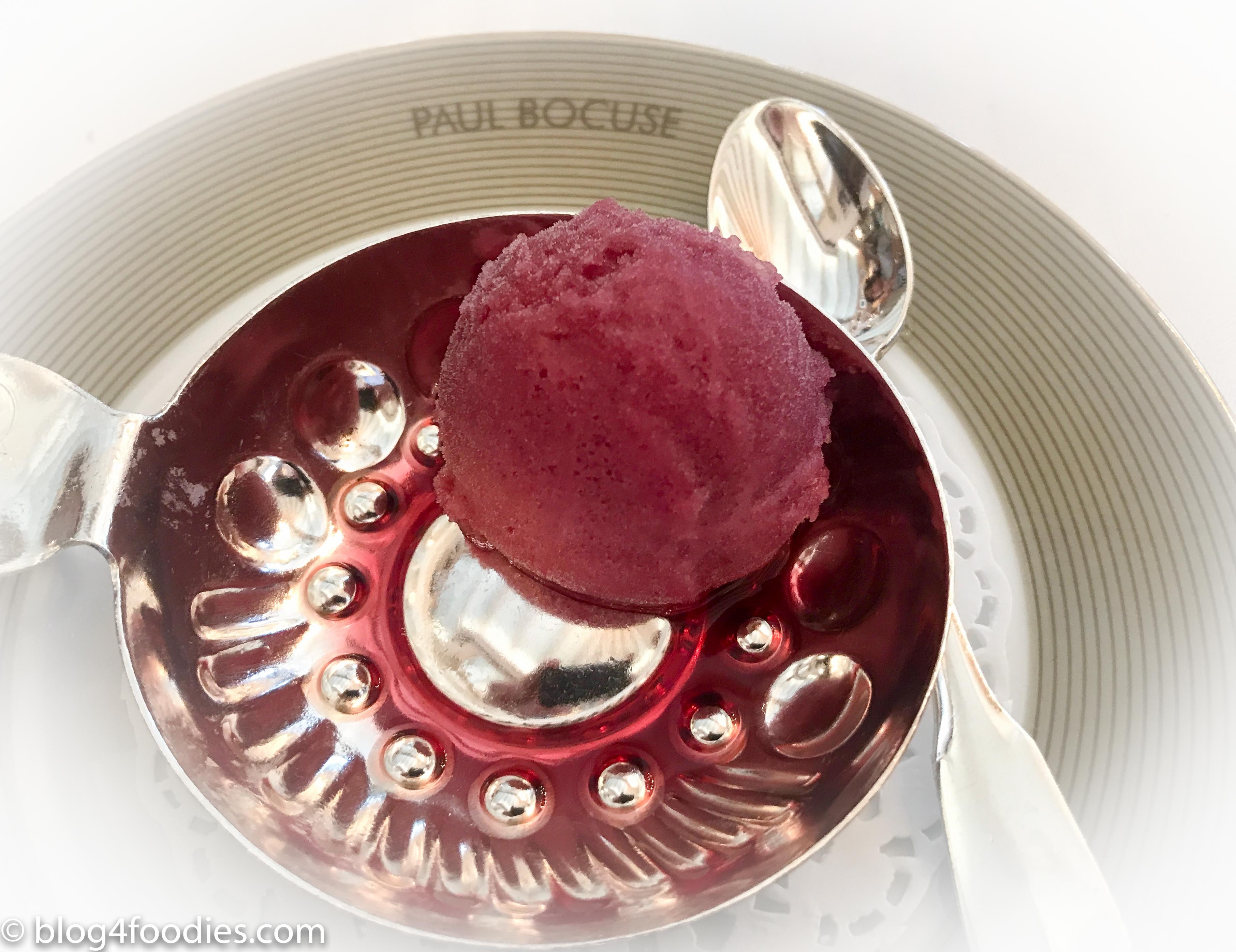 Fourth course was the Beaujolais winemaker’s sherbet. This Cassis and Beaujolais granite was fresh, but nothing special.