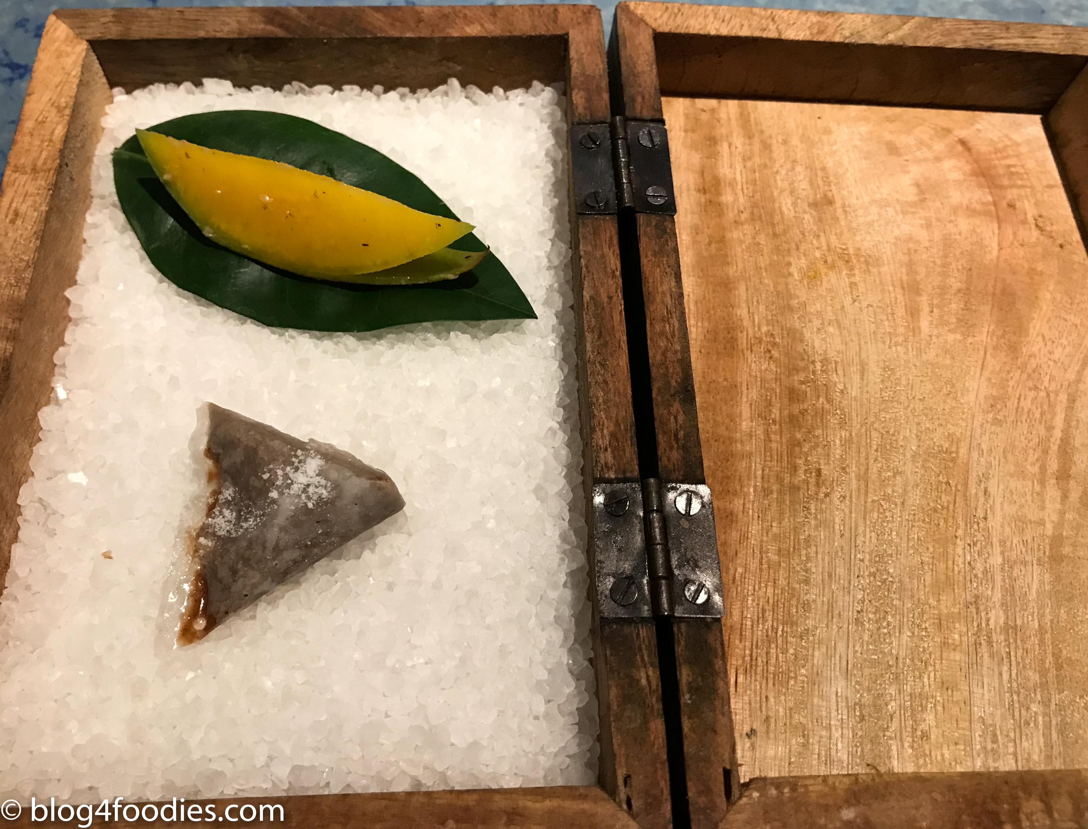 Savory walnut candy with mango, tonka beans and whisky