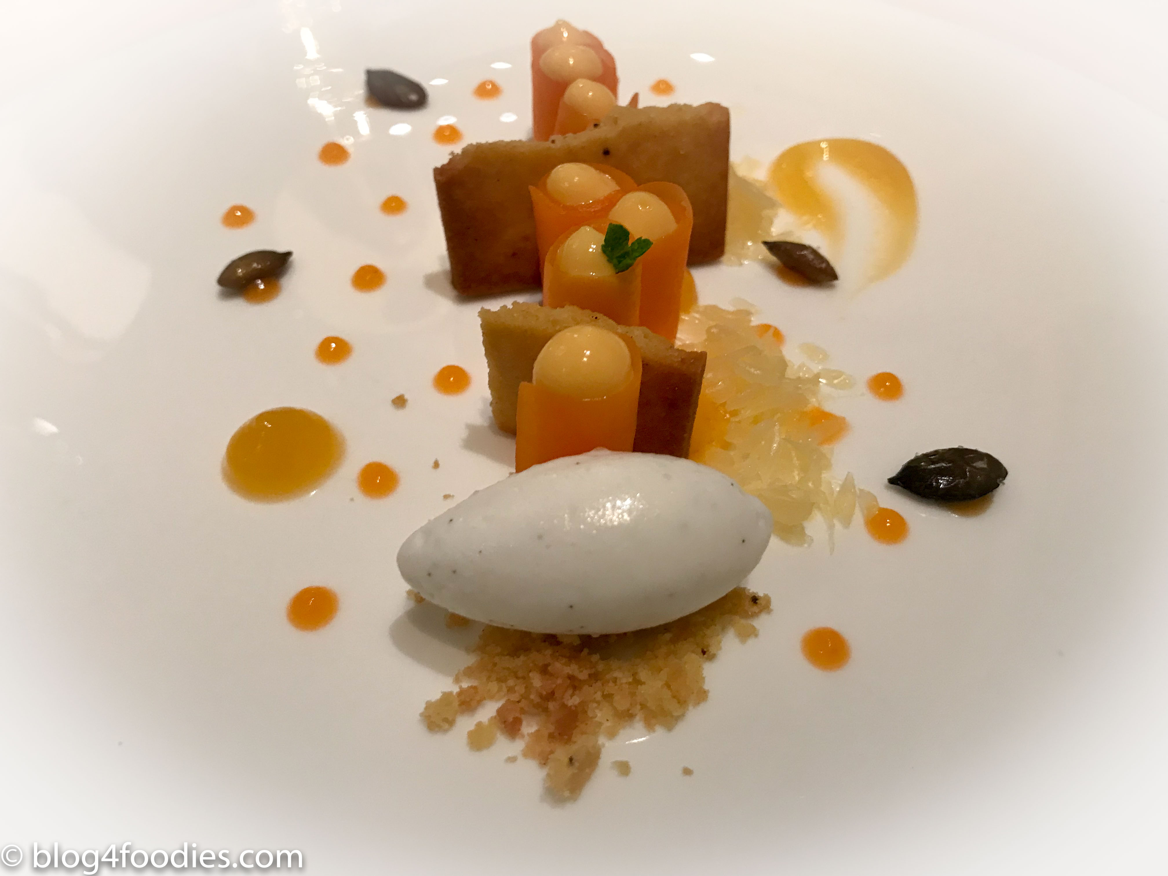 Marinated pumpkin cylinders, white vanilla ice-cream and salted caramel toffee